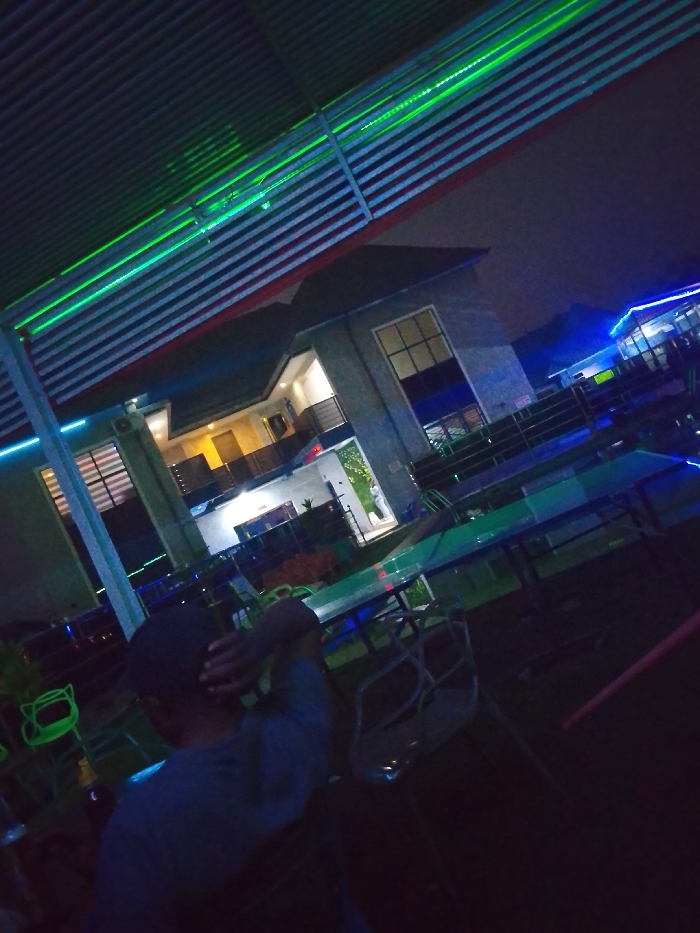 An outdoor scene at night features a building with a multistory design, partially illuminated. Green neon lights highlight the structure's roof. A person, partially visible from the back, sits at a table. Tables and chairs are scattered across the patio-like area. Faint blue lights are visible in the background, suggesting another building or feature. The overall atmosphere is dark with contrasting lights accentuating architectural details.