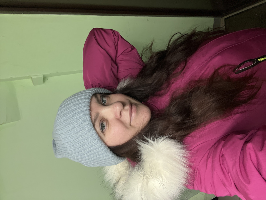 A female subject, appearing to be an adult, is depicted from the upper chest upward, centered in a portrait-oriented image. She has long, dark brown, wavy hair extending over her shoulders. She wears a light blue, ribbed knit beanie hat and a bright fuchsia-colored winter jacket featuring a prominent, cream-colored faux fur trim around the hood. Her left arm is raised, causing the jacket fabric on her shoulder and upper back to gather. A black zipper with a neon yellow pull tab is visible on the lower right side of her jacket. The subject looks directly at the camera with a slight, closed-mouth smile; her eyes are light-colored. The background consists of a uniformly painted light green wall. In the upper right quadrant, a white rectangular electrical component or conduit fitting is mounted on the wall. A dark vertical line on the far right indicates the edge of a doorframe or an adjoining wall. The setting is indoors, with even lighting. The image contains no discernible features, such as landmarks, street signs, or unique architecture, to visually corroborate the specified location of Noviy, Russia.