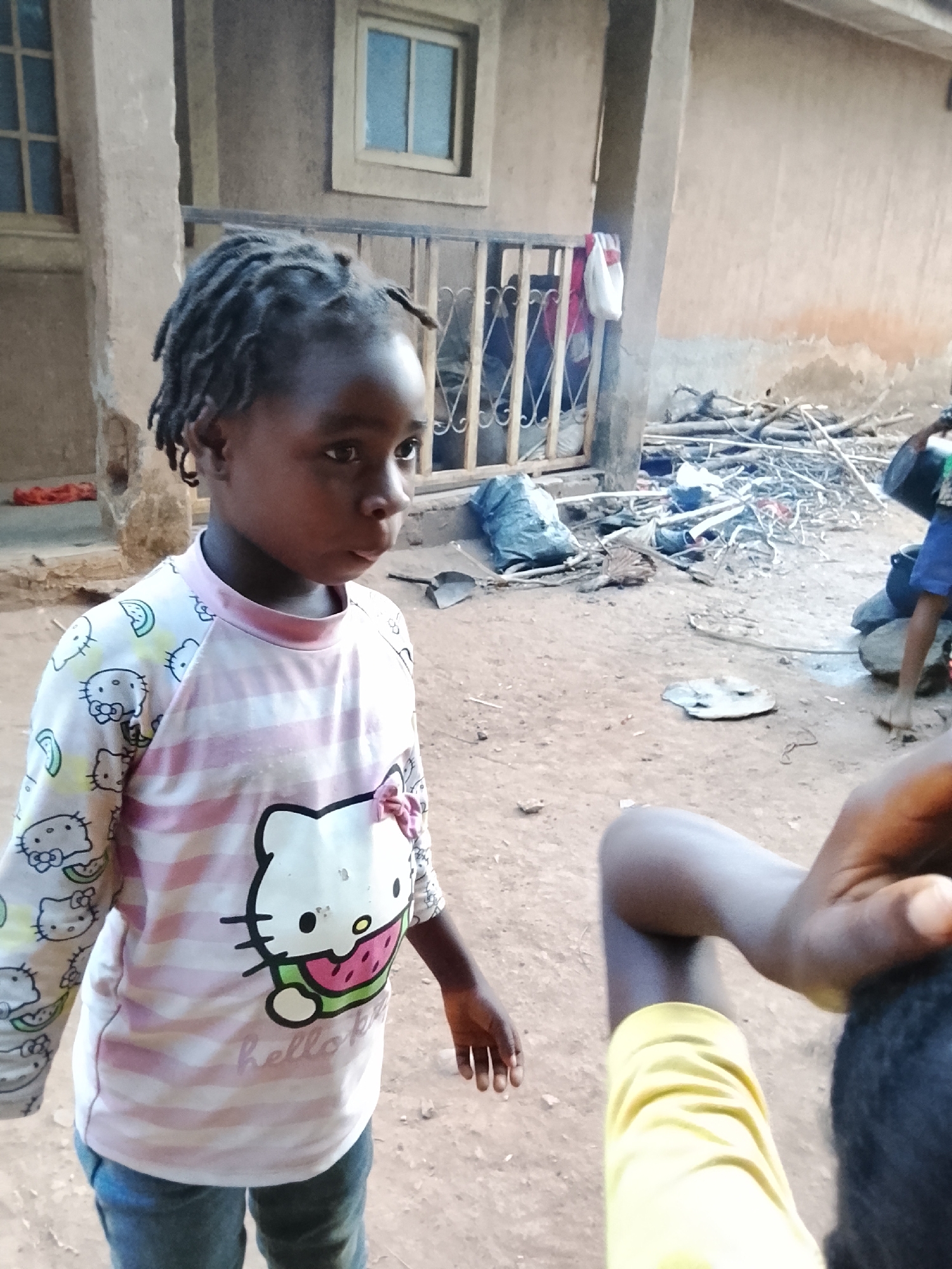 This image depicts an outdoor scene in Akwanga, Nigeria. A young dark-skinned child with dark, dreadlocked hair is positioned centrally, facing slightly to the viewer's right with a neutral expression. The child wears a long-sleeve shirt with light pink and white horizontal stripes, featuring "Hello Kitty" graphics, and blue trousers. Her left hand is visible at her side. In the immediate foreground, lower right, a partial view of another individual is visible, showing a dark-skinned arm with a yellow sleeve and the top of a head with dark hair. The ground is uneven, reddish-brown dirt, with scattered debris. In the background, a low metal railing with decorative scrollwork stands before two light-colored, stucco-like building facades. The left building section features two multi-pane windows, and the right section has one multi-pane window. A concrete pillar separates these sections. Behind the metal railing, a significant accumulation of discarded materials is present, including piles of shiny, thin metallic strips, wooden branches, dark plastic bags, and other indistinguishable items. A dark shovel-like object lies on the ground near the right building wall. To the far right, another child, partially visible, wears blue shorts and stands barefoot near an outdoor cooking setup comprising several large rocks and a dark pot.