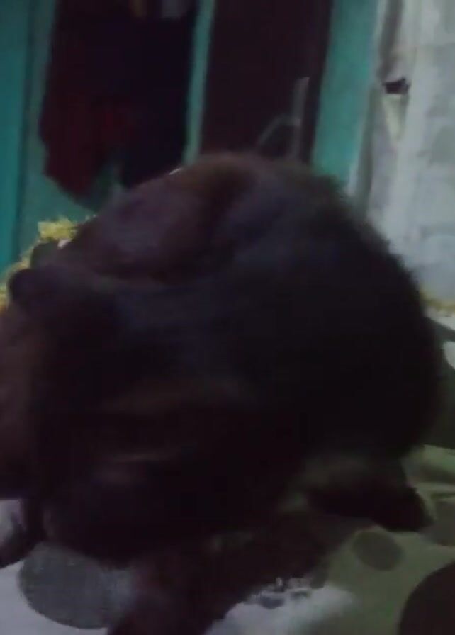 A black cat is shown close-up, licking its paw and grooming its head. The cat is sitting on a patterned surface, likely a cushion or blanket. Behind the cat, there is a blurry background that includes a green surface and some other objects. The camera is at an angle and slightly shaky.