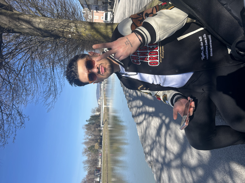 The image depicts a male individual seated outdoors on a sunny day along the right bank of the Salzach River in Salzburg, Austria, specifically near the Giselakai. The subject, positioned towards the center-right of the frame, faces the camera under a clear blue sky with the river to his left. He has dark, styled hair, light stubble, and is wearing light brown-framed sunglasses. His attire includes a white t-shirt and a black and off-white varsity jacket adorned with multiple patches, notably "CHAOS AND ORDER" in red lettering on the left chest and a textual quote ("Together, the duo built a mischievous team in the criminal underworld.") on the lower left front. A textual tattoo is visible on his right forearm. His right hand is raised, displaying a 'peace' sign, while his left hand holds a smartphone in a clear case. He exhibits a slight pouting facial expression. In the background, the Salzach River flows, with the white pedestrian Mozartsteg bridge visible further downstream. The opposite riverbank features a treeline with bare branches, indicating late winter or early spring, and distant buildings. To the immediate right, traditional buildings line a street where a white van is parked. Strong sunlight casts distinct shadows from overhead trees onto the ground in the foreground.