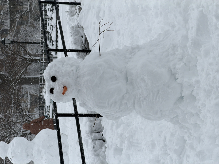 A large, three-tiered snowman stands beside a black metal fence. The snowman has a carrot nose and what appear to be black stones for eyes. A twig serves as an arm. The surrounding area is covered in deep snow, with trees and buildings visible in the background on the left. The image appears to have been rotated counter-clockwise.