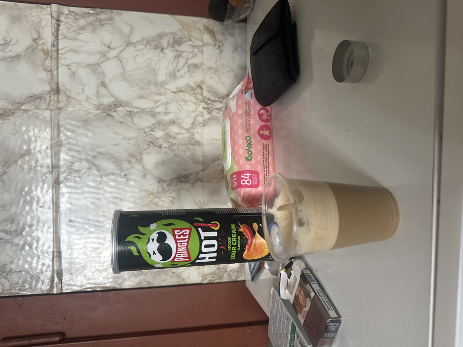 The image depicts a static indoor scene, likely on a kitchen counter or table. On a white, reflective surface, multiple consumer products are arranged. From left to right: a brown pack of cigarettes, with one cigarette partially extracted, rests next to a clear plastic cup filled with a layered cold coffee beverage topped with foam. A tall, black Pringles "HOT Kickin' Sour Cream" potato chip can stands upright behind the coffee cup and cigarettes. Immediately behind the Pringles can is a pink and white package of "БОЧКО" (Bochko) brand baby wipes, featuring Cyrillic text and indicating a count of "84" wipes. To the right of the wipes, a black bifold wallet is visible. Further to the right in the foreground, a small, silver-colored, oval metal object lies on the surface. Partially visible on the far right edge of the frame, in the background, are some fruits, possibly oranges, in a bowl. The background consists of a wall or backsplash covered with a light-colored, possibly marble-patterned, adhesive film or wallpaper. A dark brown vertical structure, consistent with a door frame or furniture edge, is visible on the far left. No individuals or active interactions are present. The presence of the "БОЧКО" brand baby wipes, a well-known Bulgarian product, indicates the location is in Bulgaria, specifically in the city of Sofia as per the prompt's context.