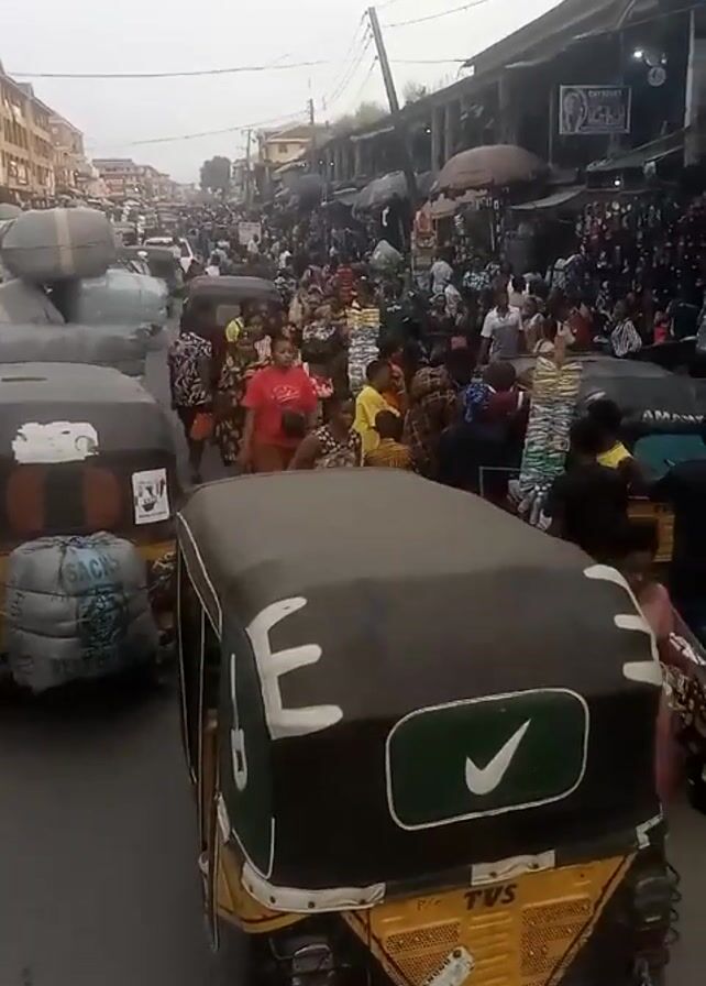 crowded street in what appears to be a market. There are many people walking around and shopping, and there are also several auto rickshaws, also known as "keke," parked along the side of the road, some loaded with goods. The auto rickshaws are the yellow and black TVS brand. Buildings and stalls line the sides of the street, and there is a power line running overhead. The sky is overcast and the overall lighting is dim.