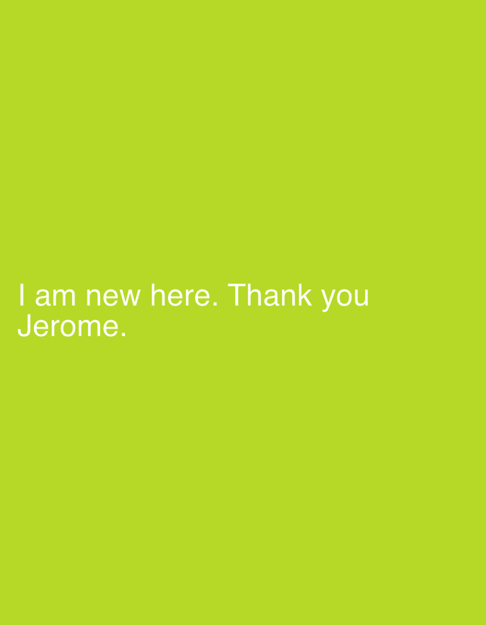A digital graphic presented in the context of the city of Ado, Nigeria, displays a solid, uniform lime green background. White sans-serif text is centrally aligned in the lower-left quadrant of the image. The text reads: "I am new here. Thank you Jerome." No human subjects, specific objects beyond the text, actions, interactions, or detailed environmental features are depicted within the graphic; the environment is solely the described uniform color field.