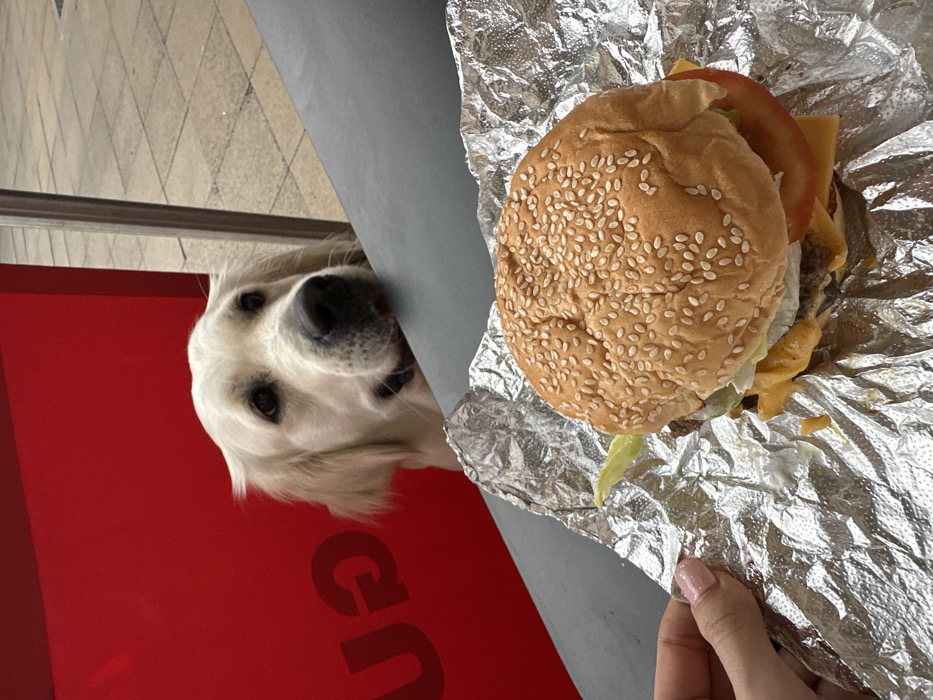 The image captures an outdoor or semi-outdoor dining scene at a Five Guys restaurant in the city of London, United Kingdom. In the foreground, a hamburger, featuring a sesame seed bun, a meat patty, melted yellow cheese, lettuce, and a prominent red tomato slice, rests on a sheet of crinkled aluminum foil. A human hand, with light pink manicured fingernails, is visible in the lower-left corner, holding the foil. Behind a dark grey counter or ledge, a light-colored Golden Retriever dog observes the hamburger with direct eye contact, its snout slightly over the ledge and a portion of its tongue visible. The background consists of a bright red vertical surface to the left, displaying partial white lettering ("UG") consistent with the Five Guys logo, and a grey tiled pavement area to the right.