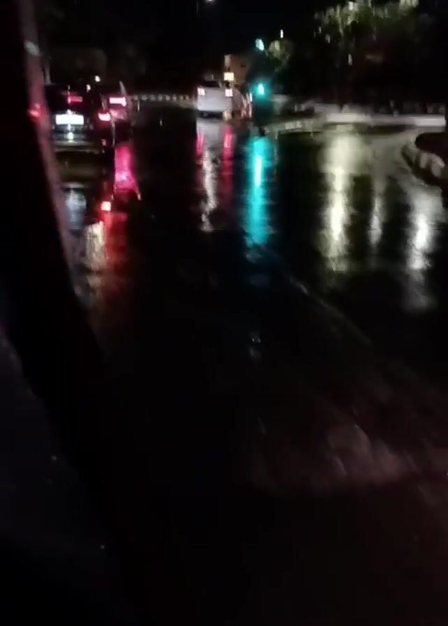 At night, a street is soaked from rain. Cars are visible on the road, their lights reflecting in the puddles. The streetlights cast a bright glow. A white car drives by.