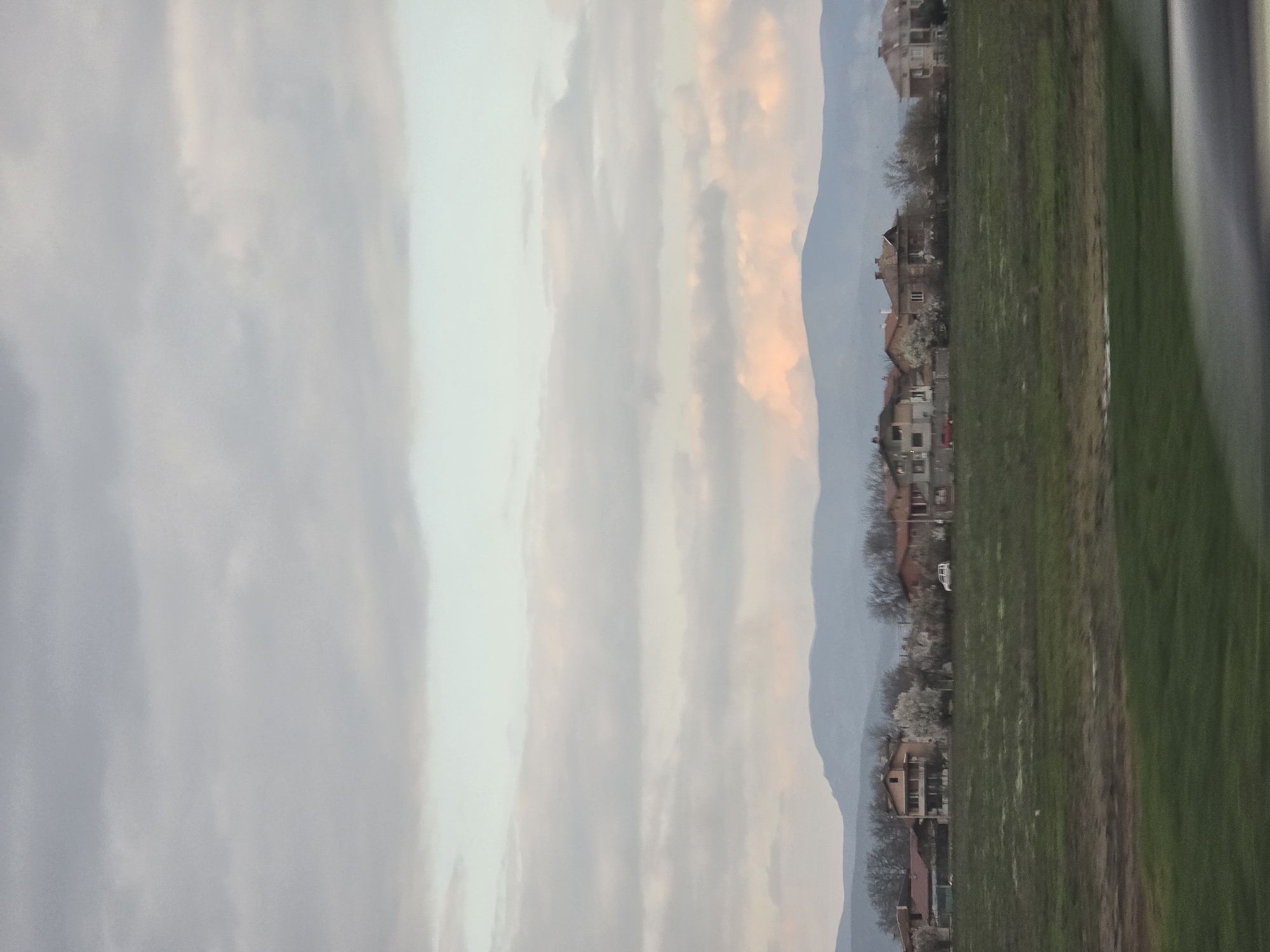 The image displays a panoramic view of a residential area in Kolarovo, Bulgaria, situated against a mountainous backdrop under an overcast sky. The upper two-thirds of the frame are dominated by a cloudy sky, exhibiting variations from light grey to a pale blue-white, with subtle pinkish-orange coloration visible in the clouds near the horizon on the right, suggesting either dawn or dusk. A range of distant, blue-grey mountains forms the horizon line. Below the mountains, a line of approximately ten single-family houses is visible. These structures feature multiple stories, predominantly reddish-brown tiled roofs, and facades in shades of brown, beige, and white. Deciduous trees, some appearing bare while others exhibit white blossoms, are interspersed among the houses, indicating an early spring season. In the midground, in front of the houses, a white van or SUV is parked on an unpaved surface. A portion of a red vehicle is visible on the far left of the residential row. The foreground consists of a large, flat expanse of green grass, showing minor variations in color and texture. The bottom edge of the image, particularly on the right, displays a blurred, dark gray object, consistent with the interior component of a vehicle from which the photograph was captured. No individuals are visible within the scene.