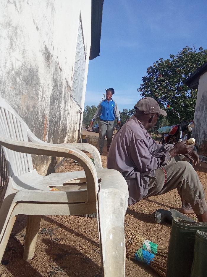 An outdoor scene shows an elderly man seated on the ground, wearing a hat and casual clothes, and holding something in his hands. Next to him is a pair of boots and a broom. In the foreground is a damaged plastic chair. A young woman in a blue and grey jacket walks in the background, further down a dirt road lined with buildings and trees. A motorcycle is parked nearby with a Ghanaian flag attached. The sky is partly cloudy.
