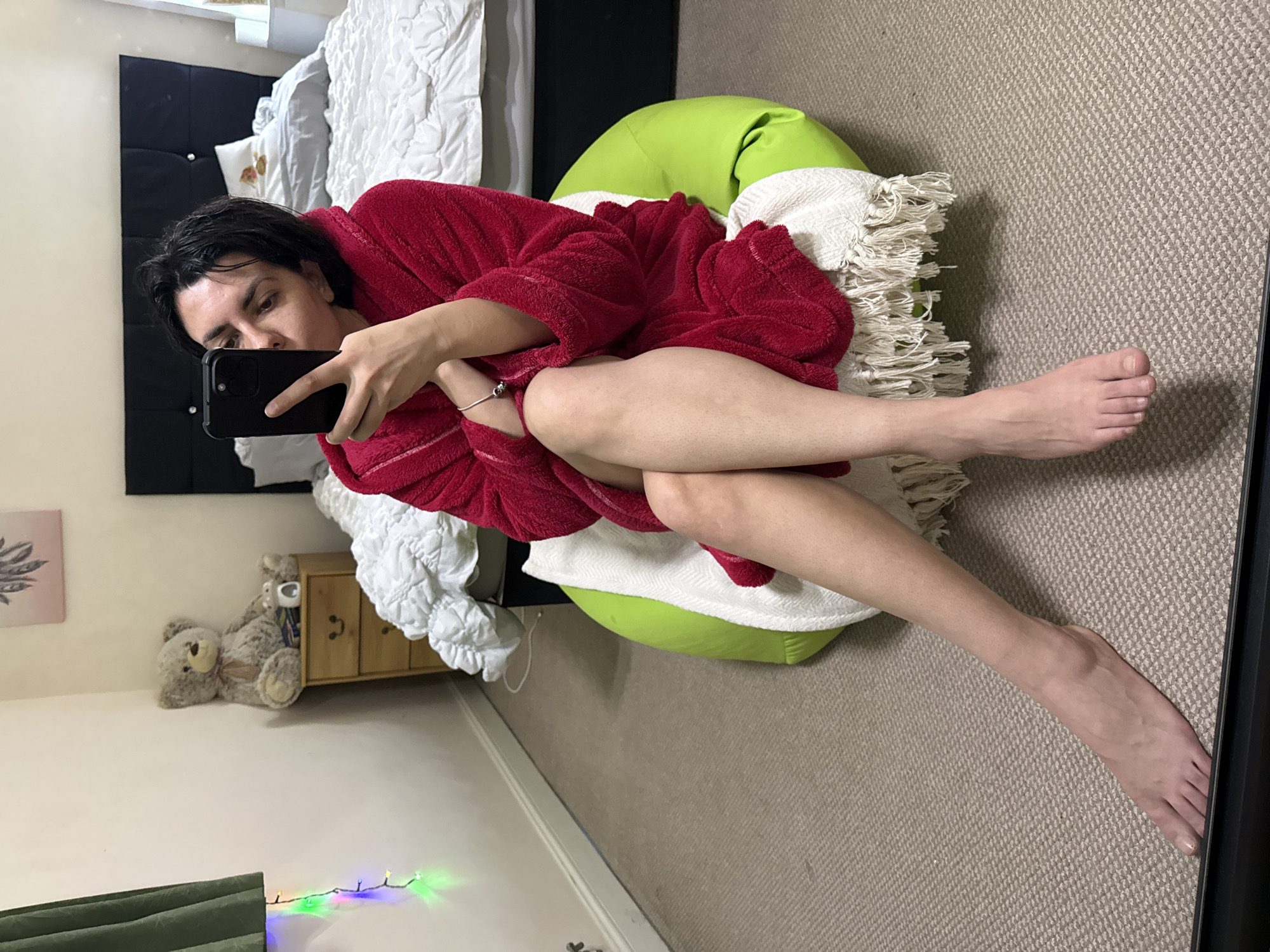 person lying on a green beanbag chair covered with a white throw blanket in what appears to be a bedroom. The person is wearing a red bathrobe and holding a black smartphone, presumably taking a selfie. One leg is crossed over the other, and the lower leg extends towards the bottom right corner of the image. In the background, there's a bed with a black headboard and white bedding. A teddy bear sits on a wooden dresser next to the bed. Christmas lights are visible at the bottom left of the image. The floor is covered with a beige carpet. There's no indication of the location being Great Yarmouth, United Kingdom, or any urban setting for that matter.