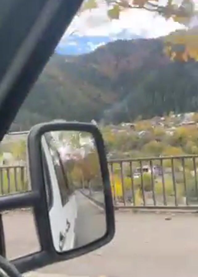 view from inside a car, looking out of the driver's side window. The car is driving on a road next to a bridge with a black railing. In the background is a town nestled in a valley with green mountains. There are trees with yellow leaves on either side of the road. The side mirror of the car is visible, reflecting the white car driving behind it. At one point, the car passes a tree, temporarily obstructing the view of the town. The voiceover mentions "National Park visitor center" and "going to town."