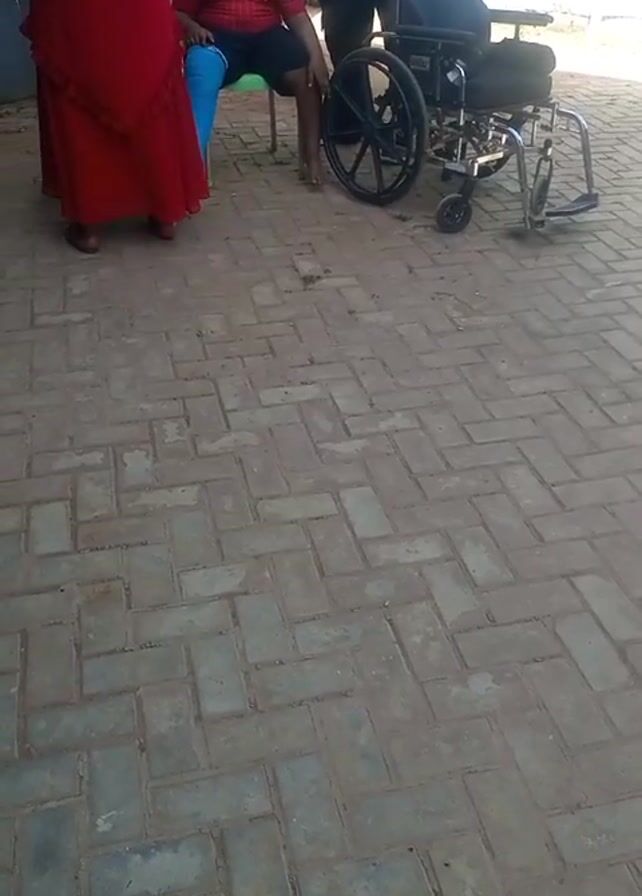 three people and a wheelchair on a brick-paved surface. A person in a long red dress stands on the left. A person wearing a red shirt, black shorts, and with a blue cast on their leg sits on a small chair. A person in a blue shirt stands behind them. A wheelchair is positioned to the right of the seated person. The background includes a corrugated metal fence.