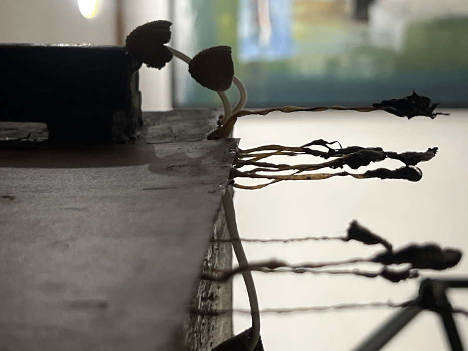 Two mushrooms sprout from the corner of a wooden structure. Their brown caps contrast with their slender white stems. Strands of brown seaweed-like material hang from the edge. The background is blurred, suggesting an indoor setting with a piece of art visible. The composition is dark, emphasizing the textures and forms of the fungi and wood.