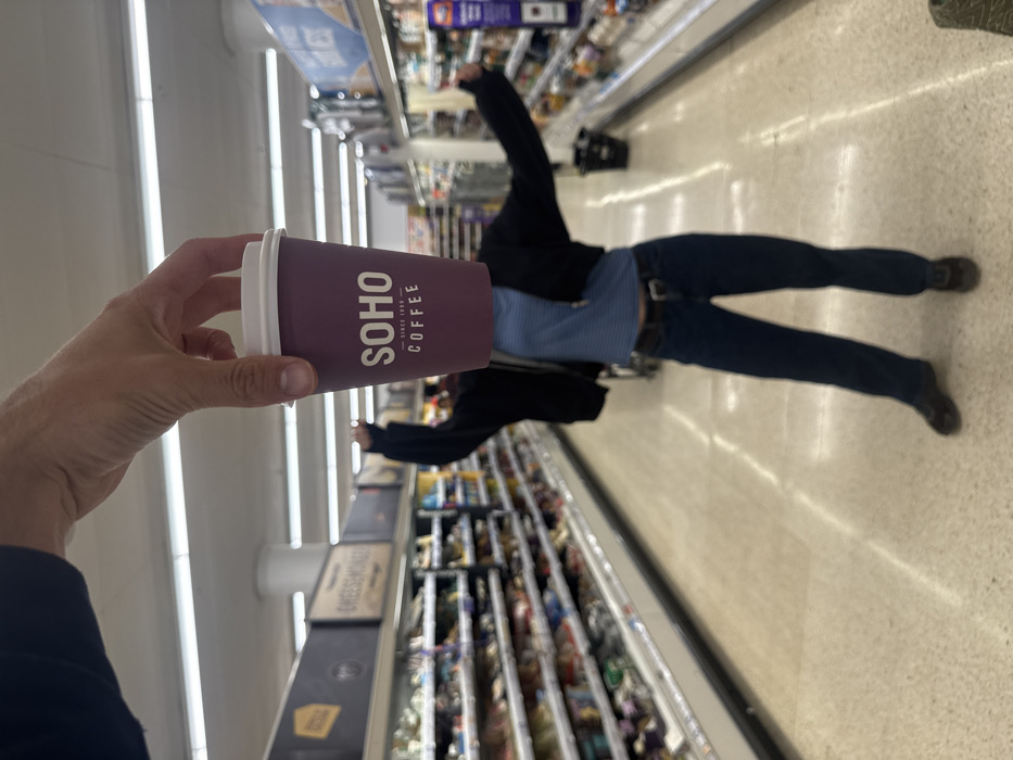 The image displays an indoor scene within a supermarket aisle. In the upper center, a human hand holds a purple SOHO COFFEE branded paper cup with a white lid. The cup, featuring "SOHO" in large white text and "COFFEE" below it, is positioned directly over the head of another individual, obscuring it. This individual, seen from the chest down, wears a light blue and white striped t-shirt, an open dark jacket, dark blue jeans with a black belt and silver buckle, and dark shoes. Their arms are raised and bent at the elbows, with hands clenched into fists on either side of the obscured head. The individual stands centrally in the aisle, facing forward. The background shows brightly lit retail shelving units extending into the distance on both the left and right sides of the aisle, stocked with various packaged products. An overhead sign on the left shelf system partially reads "CHEESEMONGERS". The floor is light-colored, appearing to be tiled or polished, and illuminated by overhead fluorescent strip lighting. A black shopping basket or bin is visible on the right side of the aisle in the mid-ground. The scene is located in a supermarket aisle in London, United Kingdom. The "CHEESEMONGERS" signage and the general aesthetic suggest it is likely a Waitrose store, a common location for SOHO COFFEE products in the UK.