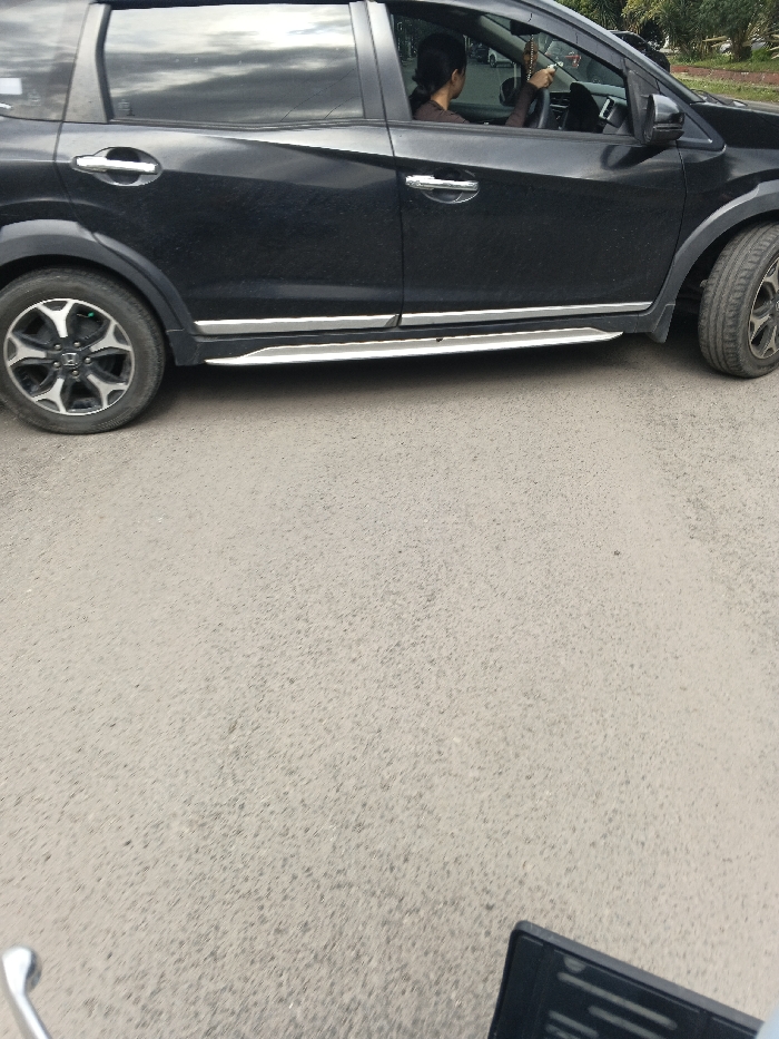 A black compact SUV, likely a Honda BR-V, is observed stationary or moving slowly on a grey asphalt road in Cangkuang Kulon, Indonesia. A female individual with dark hair tied back is seated in the driver's seat, visible through the partially reflective side window, with her hands on the steering wheel. The car features chrome door handles, silver side steps, and multi-spoke alloy wheels, with a Honda logo visible on the left front wheel. The vehicle's exterior shows signs of dust or dirt. In the immediate foreground, a chrome handlebar and a portion of a black rearview mirror from a scooter or motorcycle are visible, indicating the perspective from which the image was captured. Trees and foliage are visible in the background, above and through the car windows.