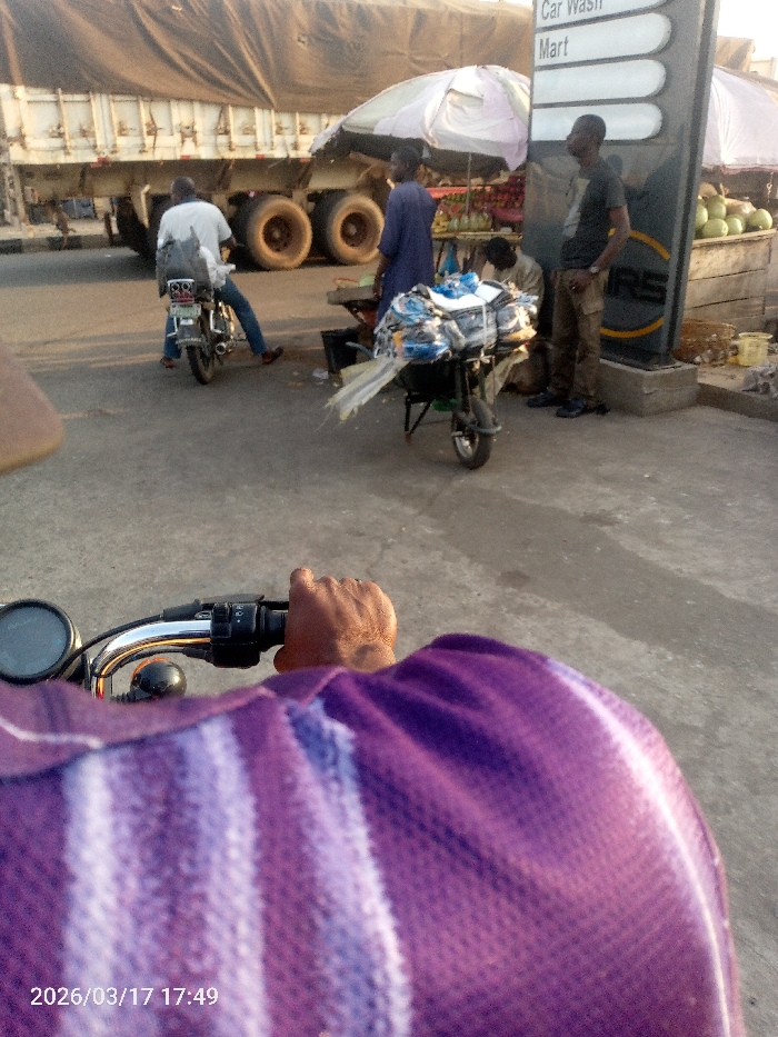 The image depicts a busy street scene in Lokoja, Nigeria, dated March 17, 2026, at 17:49. The perspective is from an individual operating a motorcycle, with a purple, horizontally striped garment and the rider's right hand on the handlebar visible in the foreground. On the road, a man in a white shirt and blue jeans is seated on a motorcycle, facing away from the camera. This motorcycle is positioned in front of a large, white articulated truck covered by a dark tarp, its large rear wheels prominent. To the right of the road, a commercial area features several individuals and vendor setups. A man in a blue garment stands beside a market stall shaded by a light-colored umbrella, displaying various fruits, including watermelons. Another individual is partially visible, seated or crouching behind this stall. A wheelbarrow-style cart, heavily loaded with bundled items wrapped in plastic and featuring hanging white fabric strips, is positioned near the stall. Adjacent to this, a dark vertical signpost displays "Car Wash," "Mart," and an "RS" logo. A man in a dark t-shirt and brown pants stands next to this signpost. Further right, a pile of large green fruits rests on a wooden display. The environment is outdoors, under natural light, with shadows indicating late afternoon.