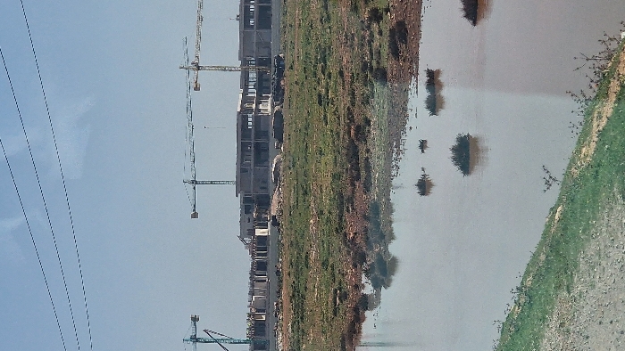 The image depicts an active construction site in Ain Chkef, Morocco, under a clear, light blue sky. In the foreground, a body of reddish-brown water occupies the lower half of the frame, containing several small, dark green scrub bushes. A grassy, partially barren embankment rises on the immediate left. The midground features an expanse of dry, patchy green and brown terrain leading to a large construction project. Multiple multi-story concrete structures are under various stages of construction, characterized by exposed rebar and unfinished walls. At least four tower cranes are visible, with two prominent yellow-framed cranes and one turquoise-framed crane dominating the skyline above the buildings. Three dark, thin horizontal lines, identified as overhead power lines, traverse the upper portion of the clear sky. No individuals or specific actions are discernible, but the presence of cranes and unfinished structures indicates ongoing development.