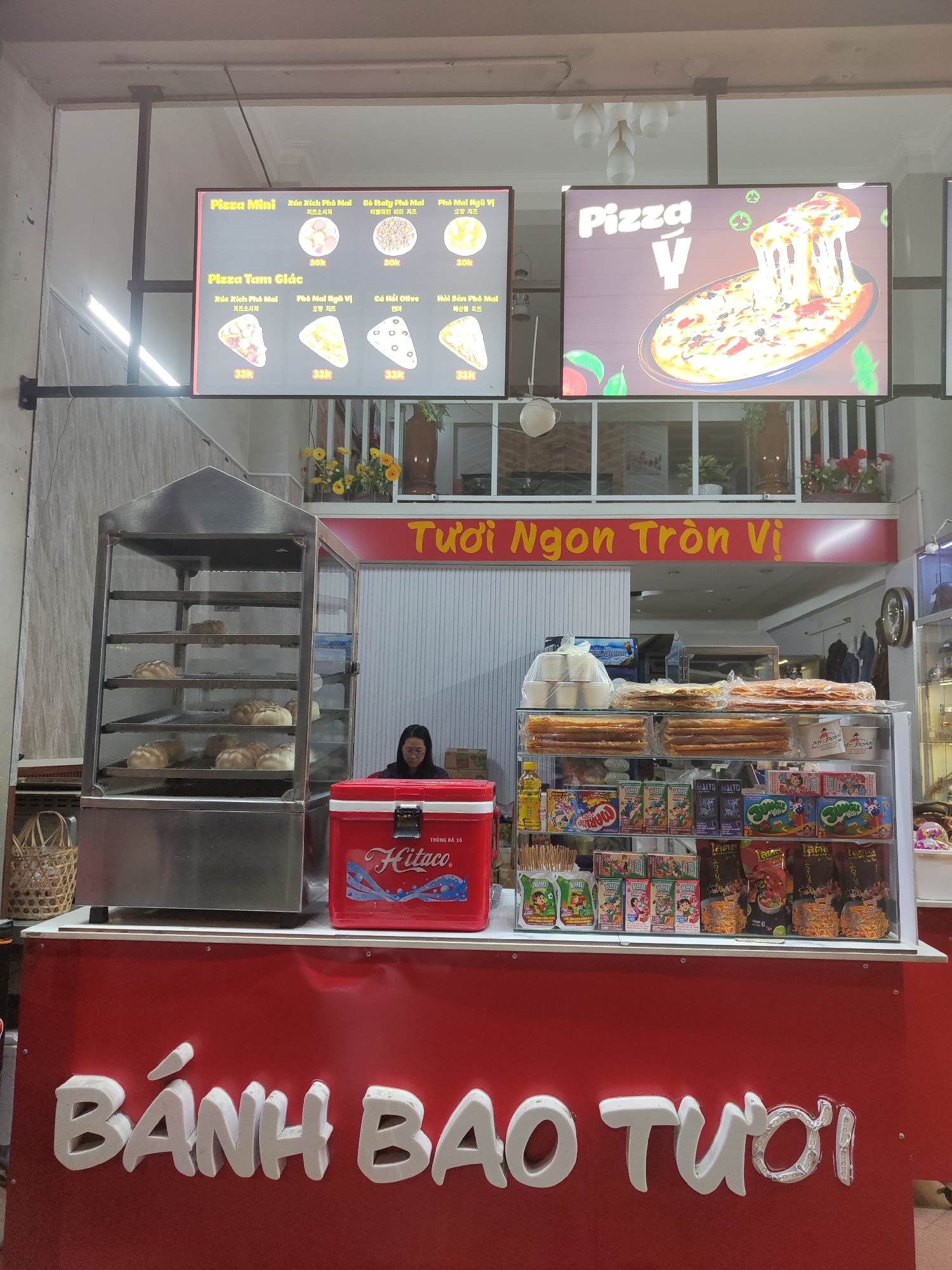 This is an image of a food stall in Da Lat, Vietnam. The stall is brightly lit and features a red counter with the words "BÁNH BAO TƯƠI" written in white lettering. On top of the counter, there is a stainless steel steamer filled with bánh bao, a red cooler with the words "Hitaco" on it, and a glass display case containing various snacks and candies. In the background, there is a person standing behind the counter. Above the stall are two illuminated signs, one advertising pizza with Korean script, and the other displaying an image of a pizza. A sign above the two pizza signs reads "Tươi Ngon Tròn Vị" in yellow letters. There are potted plants in the background and residential buildings above the store.