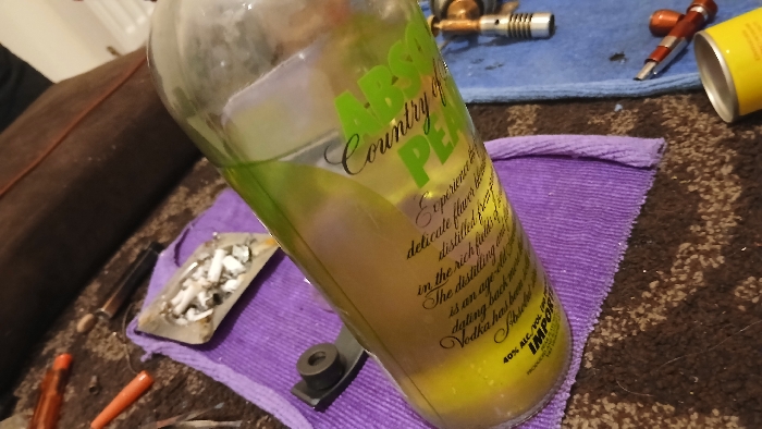 n Absolut Pear vodka bottle with a golden-yellow liquid inside. The bottle's label reads "Country of Pear" and includes details about the vodka's flavor and distilling process. The bottle sits on a purple towel next to what appears to be a dirty ashtray. In the background, a blue towel holds small metal objects and a yellow aerosol can. A brown couch is partially visible in the upper-left corner.