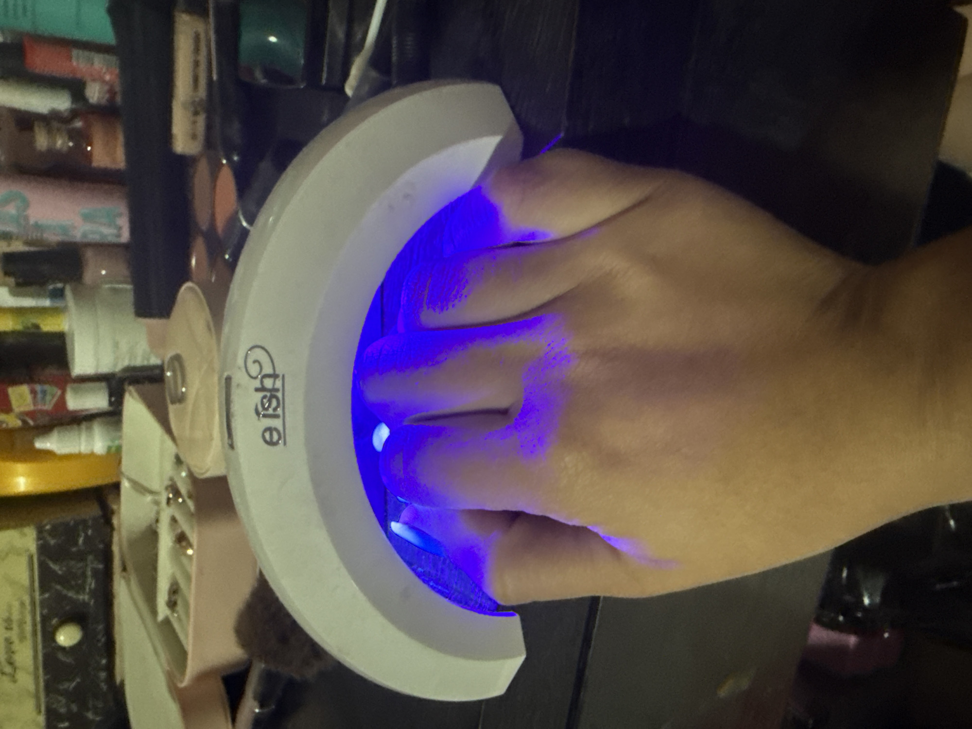 A hand is placed inside a nail lamp. The lamp is white and horseshoe-shaped, with a brand name that appears to be "eish" printed on the side. The inside of the lamp is illuminated with blue light. The hand is fair-skinned. The background is cluttered with various items, including makeup, bottles, and a small jewelry case. The image is taken indoors. There is no indication of the location of Acapulco, Mexico.