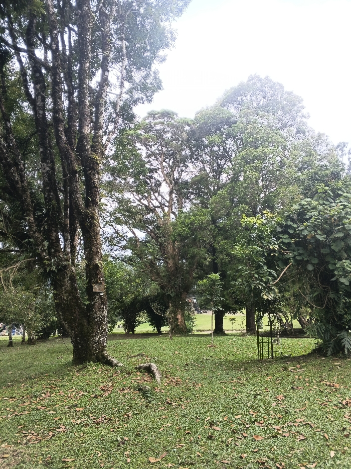 The scene depicts a verdant, park-like landscape within Munyati, Zimbabwe. Numerous tall, mature trees with rough, dark, lichen-covered trunks and dense green foliage dominate the frame, creating a partial canopy against a bright, overcast sky. In the foreground and midground, the ground is covered with well-maintained green grass, interspersed with scattered fallen brown leaves. Exposed tree roots are visible on the grass surface near the base of the prominent trees on the left. A small, dark rectangular object, possibly a wooden sign or small box, is affixed to the trunk of a tree in the left-midground. To the right, a slender, dark, open-frame metal structure, resembling a plant support or small decorative cage, stands on the grass. No individuals or discernible activities are present. The environment appears serene and natural, under bright, diffused daylight.