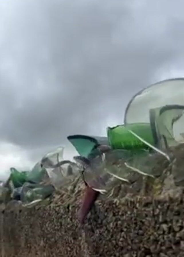 close-up view of the top of a concrete wall, which is decorated with pieces of broken glass