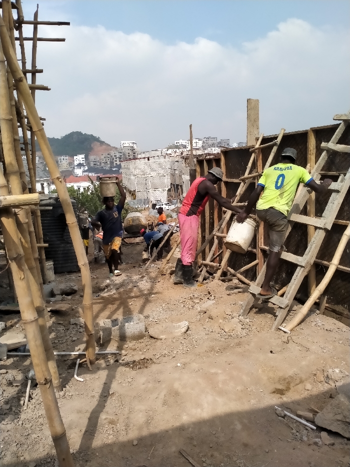 The scene depicts a manual construction site under a partly cloudy daytime sky in an urban area of Abuja, Nigeria
