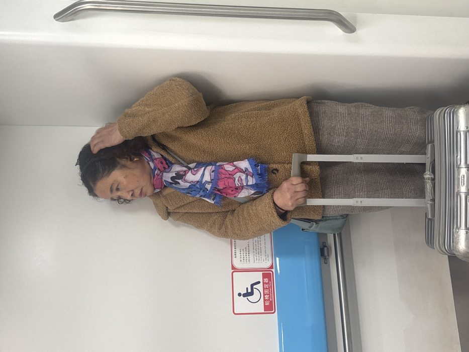 An older woman stands holding the handle of a silver suitcase on a train. She wears a tan jacket, plaid pants, and a scarf with blue, pink, and white patterns. Her left hand rests on her head. A silver handrail is visible above, and a blue-and-white sign with a wheelchair icon is on the wall. The scene is brightly lit.