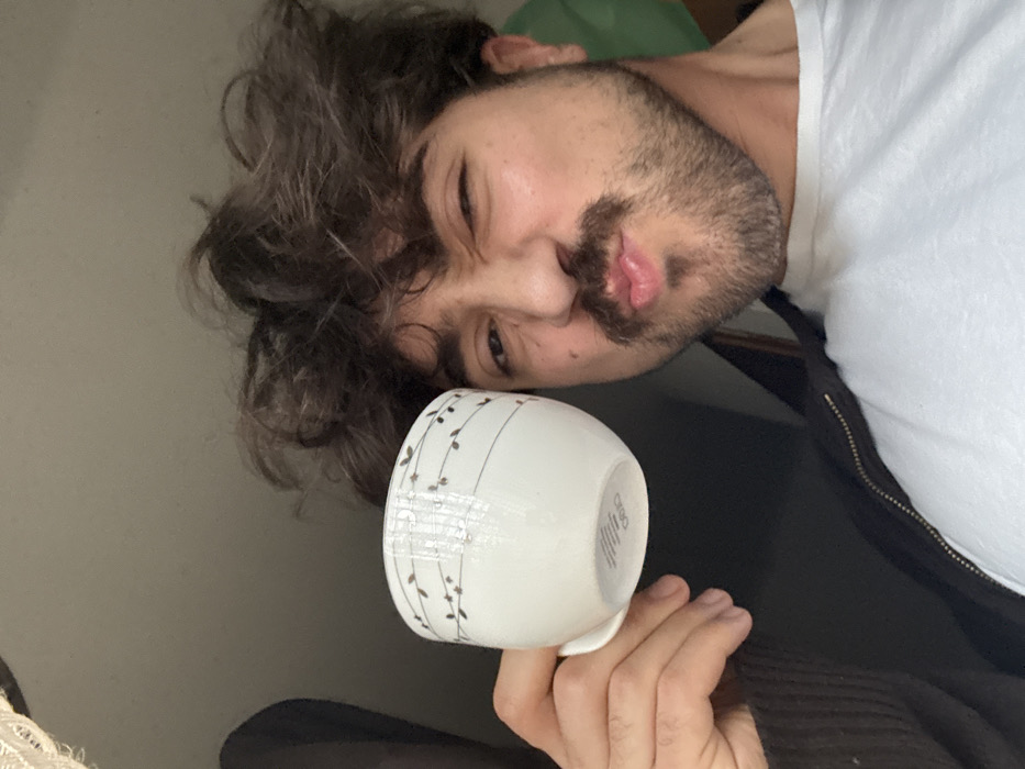 A male individual, located in Primorsko, Bulgaria, is depicted in a close-up, chest-up shot. He possesses dark, medium-length curly hair, a beard, and a mustache. His right eye is squinted, and his lips are puckered. The individual holds a white ceramic cup with a small handle in his left hand, positioned near the left side of his face. The cup features a delicate pattern of black lines and small leaf-like elements along its upper rim, with discernible text, possibly "CRISTO," on its bottom surface. He is dressed in a white t-shirt underneath an open dark-colored jacket or cardigan. The background is largely dark and indistinct, suggesting an indoor environment, with a lighter ceiling or upper wall area visible. A faint, light green object, possibly a balloon, is partially visible on the far right of the frame.