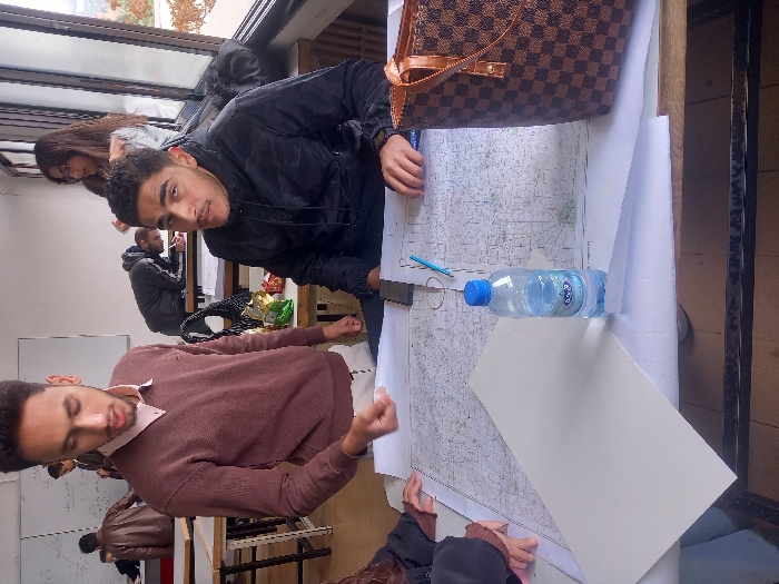 This image depicts an indoor scene in what appears to be a classroom or workshop in Al-Qanawat Municipality, Syria. In the foreground, two young adult males are positioned around a desk covered with maps and papers. On the left, a male with short dark hair and a light beard/stubble, wearing a maroon V-neck sweater over a light pink collared shirt and light pants, stands and gestures with his right hand towards a map on the desk. His gaze is directed downwards. To his right, a second male with dark hair, a mustache, and a short beard is seated, wearing a dark camouflage-patterned hoodie. He looks directly at the camera with a neutral expression, his hands resting on the desk. On the desk in front of them, several large sheets of paper are visible, including what appear to be detailed maps, possibly of an urban area. A blank rectangular sheet of white paper lies on top of the maps. A clear plastic water bottle with a blue cap, labeled "Safaa," stands upright on the maps. A blue pencil or pen is also on the desk. To the right, a brown and black checkered handbag with light brown leather straps rests on the desk next to the seated male. A gold-colored wrapper, possibly for candy or snacks, is partially visible behind the standing male. In the midground, a young female with long dark hair, wearing a light-colored top, stands near a large window on the right side of the frame, looking towards the left. Several other individuals are partially visible in the background, seated at desks and leaning over papers, suggesting engagement in similar activities. One individual in a brown leather jacket is visible in the background on the left. The room features white walls, with a whiteboard partially visible in the background. Large windows on the right offer a view of outdoor trees and foliage. The furniture consists of wooden desks with light-colored tops and visible chair legs. The floor appears dark.
