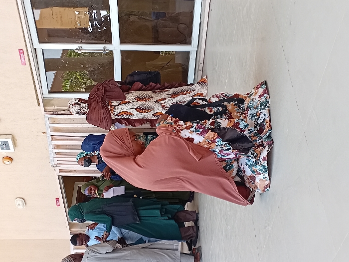 The image depicts a gathering of individuals outside a building in Kwazailewa, Nigeria. The scene is illuminated by natural light, suggesting daytime. The ground is paved with light-colored tiles. The background features a beige wall with two doorways; one is an open entrance to a dark interior, and the other is a glass double door with a sign taped to its surface. A red rectangular sign is affixed above each doorway, with partial text visible, and an electrical box is mounted on the wall. In the foreground, a female subject kneels on the tiled floor, her head bowed, appearing to engage with an object in her lap. She wears a rust-colored headscarf and a long, multi-patterned dress. A black bag rests beside her. In the midground and background, approximately seven additional individuals are present. On the left, a male subject in light traditional attire stands beside a male in a light blue shirt and dark trousers, who holds a mobile phone. A female subject in a dark green hijab and dress holds a piece of paper. Another female in a green hijab and patterned top also holds paper. Further right, a female wearing a dark blue hijab and face mask looks towards the right. On the far right, two female subjects face away from the camera; one wears a brown head covering and a long patterned dress, carrying a black backpack. The individuals appear to be waiting or interacting, with some holding documents.