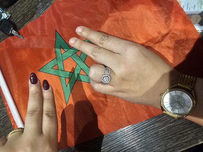 - "A hand wearing a gold watch and a large diamond ring makes a peace sign over the Moroccan flag" by FM-HWmcZ2, licensed under CC BY 4.0
