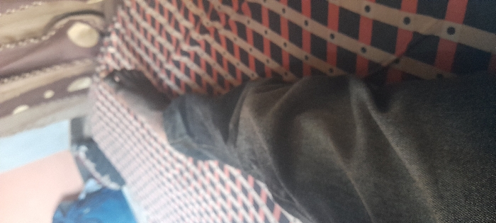 The image displays a close-up, first-person view of a person's lower right leg and bare foot, resting on a patterned surface. The leg is covered in dark grey or blue denim jeans. The right foot, exhibiting dark skin, is visible at the ankle, with the toes slightly curled. The surface beneath the leg is textile, featuring a repeating geometric pattern of diamonds or plaid in light beige, dark brown, and reddish-orange, with small dark dots within some sections. In the blurred background, a light pink wall is partially visible on the upper left, alongside a blue object. To the upper right, another patterned fabric, possibly a curtain or upholstery, with large oval shapes on a dark brown background, is present. The scene is indoors, in the city of Unknown, Unknown. The individual's leg is static, indicating a resting posture.