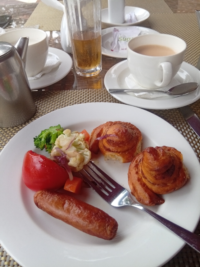A white plate holds breakfast: a sausage, tomato wedge, steamed vegetables, and two cinnamon rolls