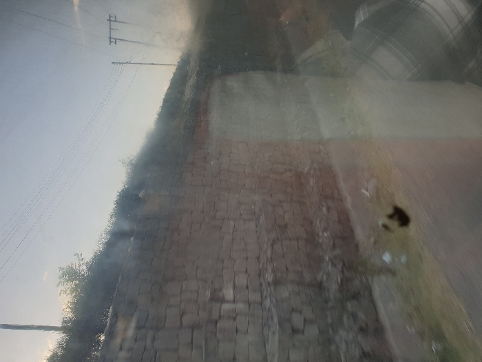 A brick wall runs along the side of a road, partially obscured by reflections. Beyond the wall, vegetation grows along an embankment. Power lines stretch across the sky above. A plaid-patterned shirt is visible in the reflection. The image appears to be taken from inside a vehicle. A dark spot and other imperfections mar the window.