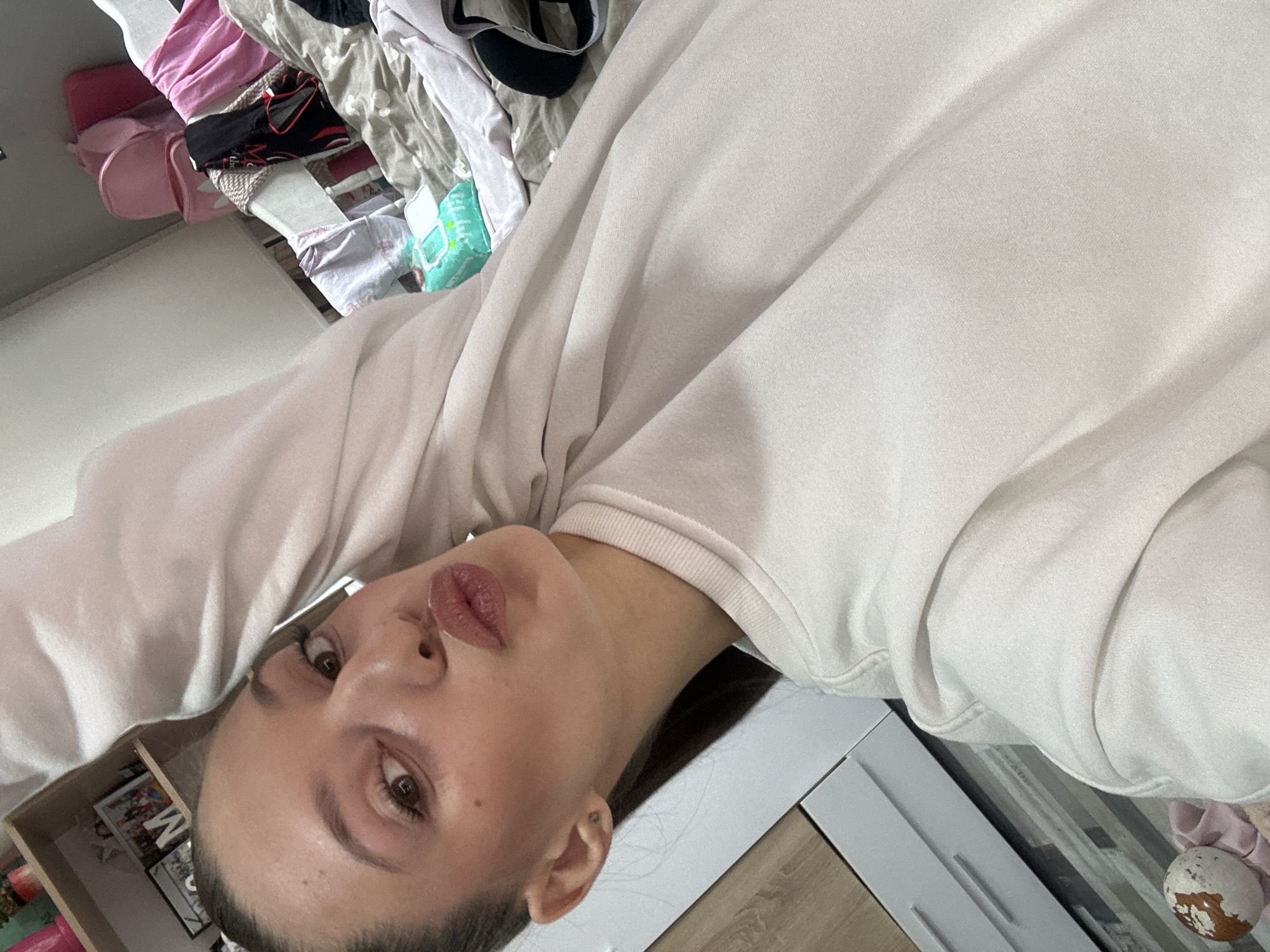 A woman is shown in a selfie-style image, wearing a light-colored sweatshirt. Her face is tilted towards the camera, and she has dark hair pulled back. A cluttered surface is visible behind her, with clothes and other objects piled up. A piece of furniture with drawers is partially visible in the background. There is no information in the image to determine the location is Pernik, Bulgaria.