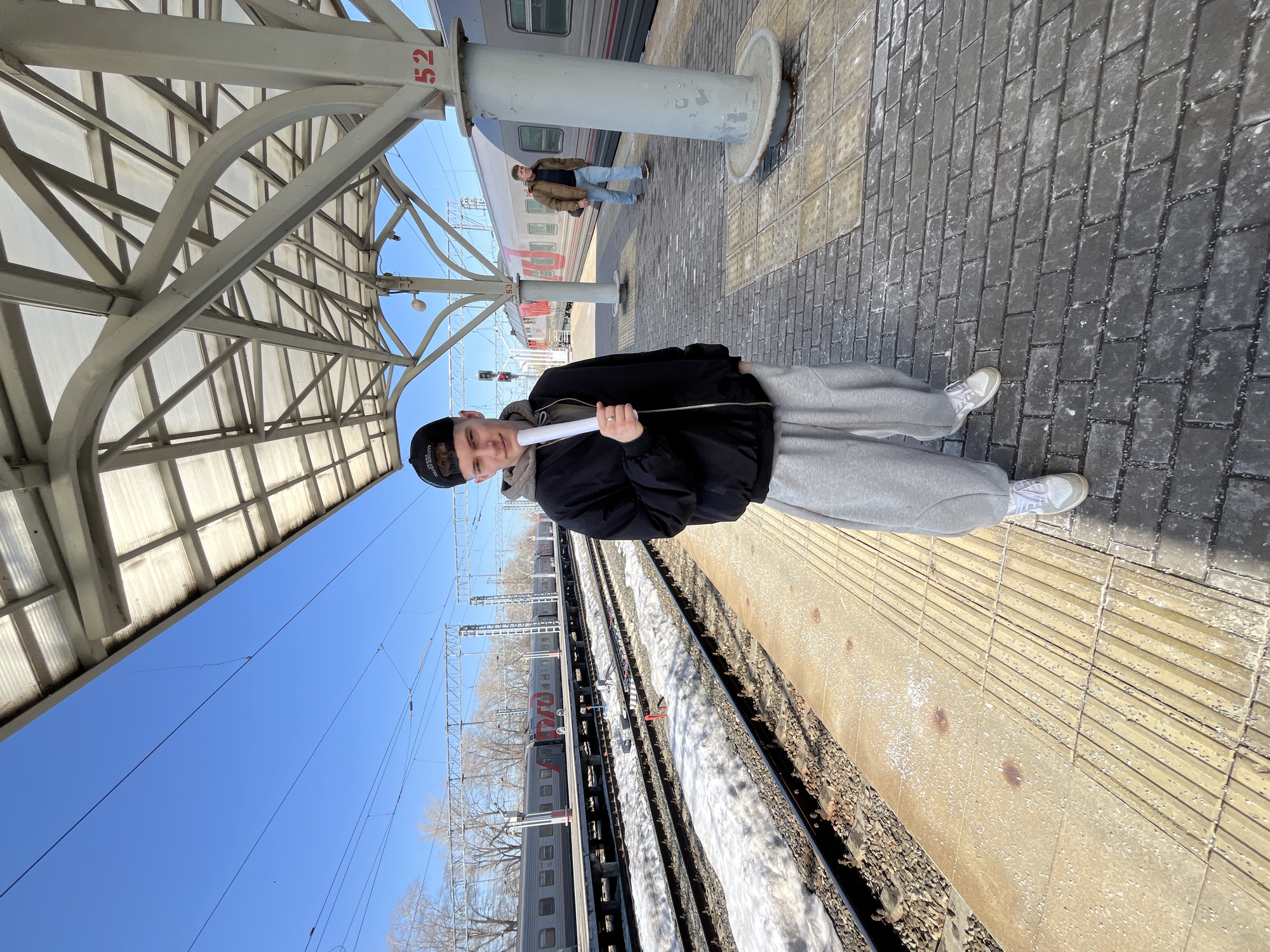 A young man stands on a train platform next to train tracks. He is wearing a black jacket, grey sweatpants, white sneakers, and a black baseball cap. He holds a white object. The platform is made of paving stones. Overhead, there is a metal structure. In the background, a train is visible, along with another person standing near a pillar marked with the number 52. The sky is clear and blue. Bare trees are visible beyond the train. The scene appears to be outdoors on a sunny day. The location is Tashevka, Russia.