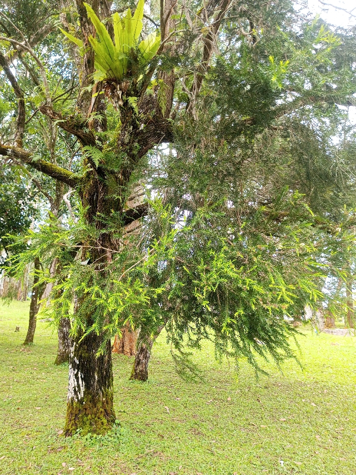 A lush green scene features a large tree adorned with vibrant green foliage. The tree trunk is covered in moss and lichen, adding texture to its base. Atop the tree's branches, a bird's nest fern thrives. The background reveals more trees in a grassy field, partially bathed in sunlight. The overall composition suggests a serene, natural environment.