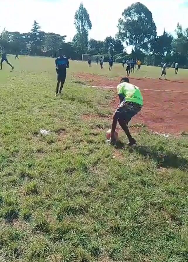 Here's a concise description of the video: The video shows a rugby game in progress. Several players are on a grassy field with a dirt patch, some running towards the goal post. In the foreground, a player in a neon green jersey picks up the ball, dodging another player in a dark blue jersey. In the background, trees are visible under a sunny, partly cloudy sky.