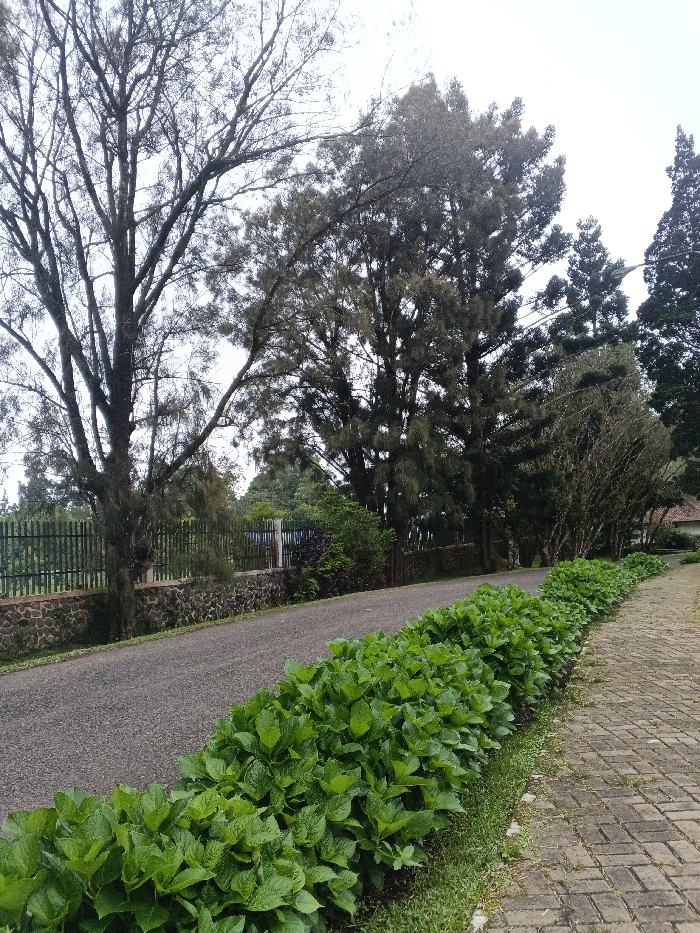 The image presents a static outdoor scene in Kadoma, Zimbabwe, under an overcast sky. A dark grey asphalt or gravel road occupies the left portion of the mid-ground, gently curving upwards and to the right. Parallel to the road, on the right side, is a light brown paved pathway constructed from rectangular pavers laid in a herringbone pattern. Separating the road from the pathway is a continuous, dense hedge of vibrant green, broad-leafed plants, approximately hip-height, with a narrow strip of green grass adjacent to the paved path. To the left of the asphalt road, a low wall built from irregular dark grey and brown stones is visible, topped by a dark green metal fence composed of vertical bars. Behind this fence, a tall deciduous tree with extensive bare, dark branches stands prominently. Further into the background, a cluster of numerous tall evergreen trees with dark green foliage dominates the upper and right portions of the frame. One evergreen tree shows visible power lines and a utility pole in its upper branches on the right. A small, partial view of a building with a reddish-brown tiled roof is discernible in the far right background, partially obscured by trees. No individuals, vehicles, or animals are present in the scene.
