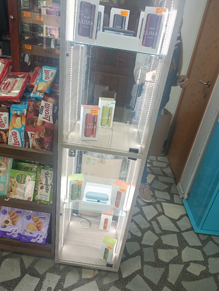 The image displays the interior of a retail establishment in Silistra, Bulgaria. A tall, narrow, glass display cabinet with light wood-grain effect borders stands centrally, illuminated by internal LED strip lighting. The cabinet is filled with packaged IQOS LUMA electronic smoking devices and accessories in various colors, including maroon, red, green, and light blue, many bearing orange price tags. To the left, a wooden shelving unit contains packaged food products such as 'Lovita' branded biscuits, 'Pismaniye' (floss candy), 'Halva,' and 'Konfetto,' identifiable by their packaging and Cyrillic text. On the right, a person is partially visible from the waist down, wearing dark trousers and brown shoes, standing near a light brown wooden door with a silver handle and a partial view of a light blue cabinet. The floor is tiled with irregularly shaped grey and darker grey/black mosaic patterns. A faint reflection of the person is visible in the glass of the display cabinet.