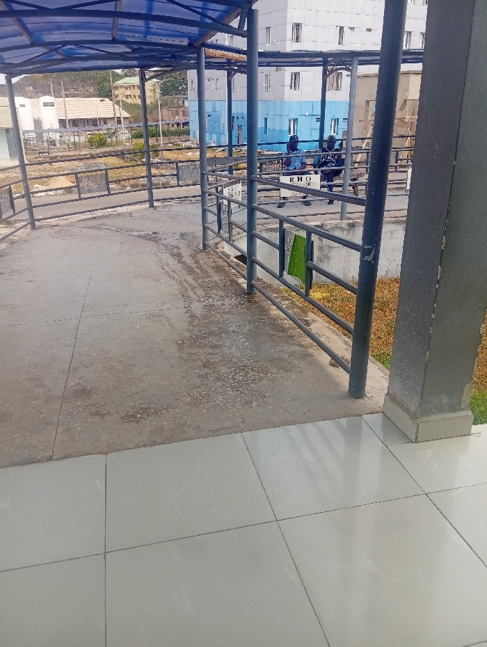 This image displays a covered pedestrian walkway located in Okene, Nigeria. The foreground features a light-toned, tiled floor. This transitions into a grey concrete walkway that shows signs of surface discoloration, leading towards the mid-ground. The walkway is sheltered by a translucent blue canopy supported by dark metal pillars and a corresponding metal railing system. In the mid-ground, beyond the concrete path and railings, two males in dark clothing are standing. They are positioned near a white sign, prominently displaying "RHO," with additional text partially obscured beneath it. A rectangular green object is affixed to the metal railing closer to the camera's perspective. The background shows a multi-story building with a light grey and blue facade. Other less defined structures are present. An area of sparse, dry vegetation lies immediately beyond the walkway's railing. Distant hills or mountains are visible on the horizon under apparent daylight conditions. No specific actions or interactions are discernible among the individuals.
