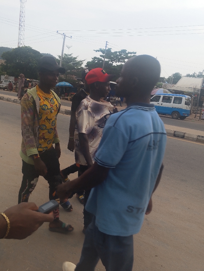 This image captures an outdoor street scene in Zango-ndaji, Nigeria, under a bright, overcast sky