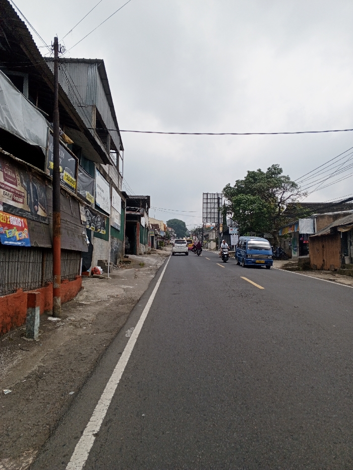 This image depicts a street scene in Multhan, India, under an overcast sky. The view is along an asphalt road with a solid white line marking the left edge and a broken yellow line indicating two lanes. On the left side, a concrete sidewalk is present, bordered by a low, orange-painted wall. A dark utility pole stands prominently in the mid-foreground. Behind the pole, a multi-story building with a corrugated metal roof features multiple advertisements and banners on its facade, including text partially visible as "25.000", "GARAM", and "BARU". Further down the street on this side, additional indistinct structures are visible. On the right side of the road, the ground is unpaved, leading to various single-story buildings, many with corrugated metal roofs. A large green tree is present in the mid-distance, behind which a large, bare billboard structure is visible. Vehicular traffic includes a white passenger vehicle in the distant background moving away from the viewer. A blue van is positioned on the right side of the road, facing away. Two motorcycles are visible: one with a single male rider, wearing a light-colored shirt, is moving towards the viewer in the right lane; another motorcycle with two riders, one appearing to be female with a head covering, is further ahead, also moving away in the right lane. Numerous overhead utility lines traverse the scene, connected to poles on both sides of the street.