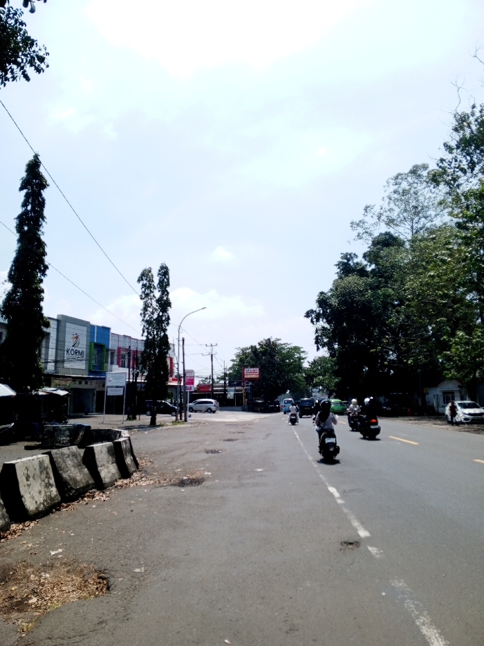 This image depicts a daytime street scene in Multhan, India, under a bright, partly cloudy sky. The perspective is from the left side of an asphalt road, looking down a straight section. The road features a broken white center line and a solid yellow line near the right shoulder. Multiple potholes and worn patches are visible on the asphalt surface. On the immediate left foreground, four weathered grey concrete jersey barriers are stacked along a dirt and sparse vegetation shoulder. Along the left side of the road, a row of multi-story commercial buildings is visible. The most prominent building displays "KORMI" vertically in red on a white background, with a red and blue logo. Utility poles and a street lamp are situated in front of these buildings, with numerous overhead power lines traversing the scene. A white car is parked on the left side near the buildings. Several tall, slender trees with dark green foliage are also present on the left. On the right side of the road, a dense line of mature trees with dark green foliage creates a canopy, obscuring much of what lies behind them, though a small white building is partially visible further down. A prominent red sign with white lettering, displaying the partial word "ALFA," is visible on a pole on the right side of the road, near an apparent entrance or turn-off. A blue van and another white car are visible further down the road on the right. Approximately five individuals are visible riding motorcycles or scooters down the road, all wearing helmets. One rider in the immediate foreground, on a white scooter, is wearing a dark top. Another rider wears a light-colored head covering. The vehicles are traveling away from the viewer, indicating active traffic flow.