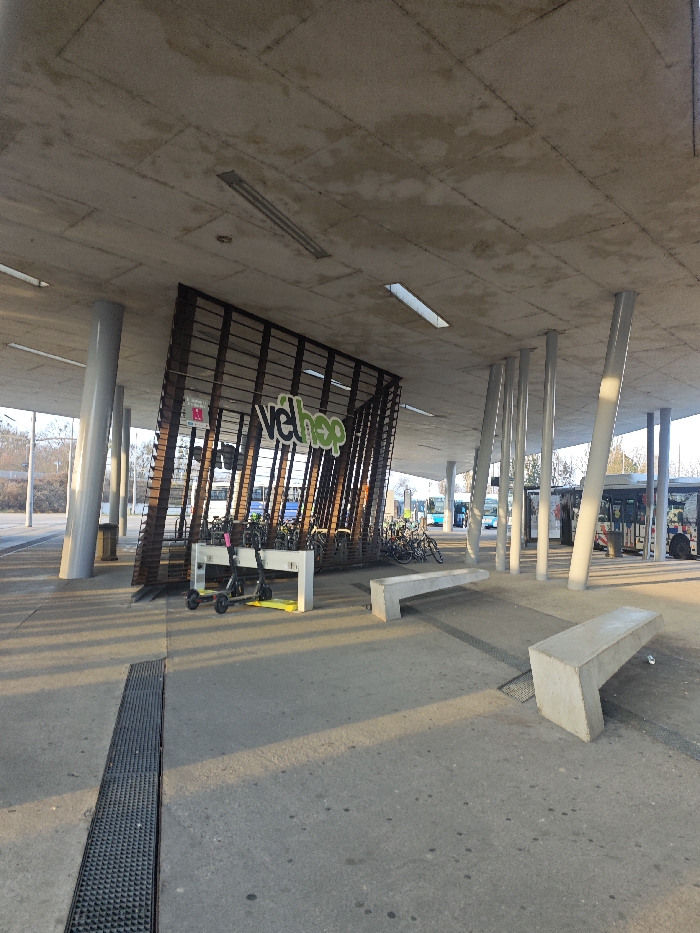 Under a concrete awning supported by round and angled pillars, a bike rack stands with the "velhop" logo. Nearby, are parked electric scooters. Two concrete benches are situated on the paved ground with a metal grate running lengthwise. In the background, buses and a vehicle are visible.