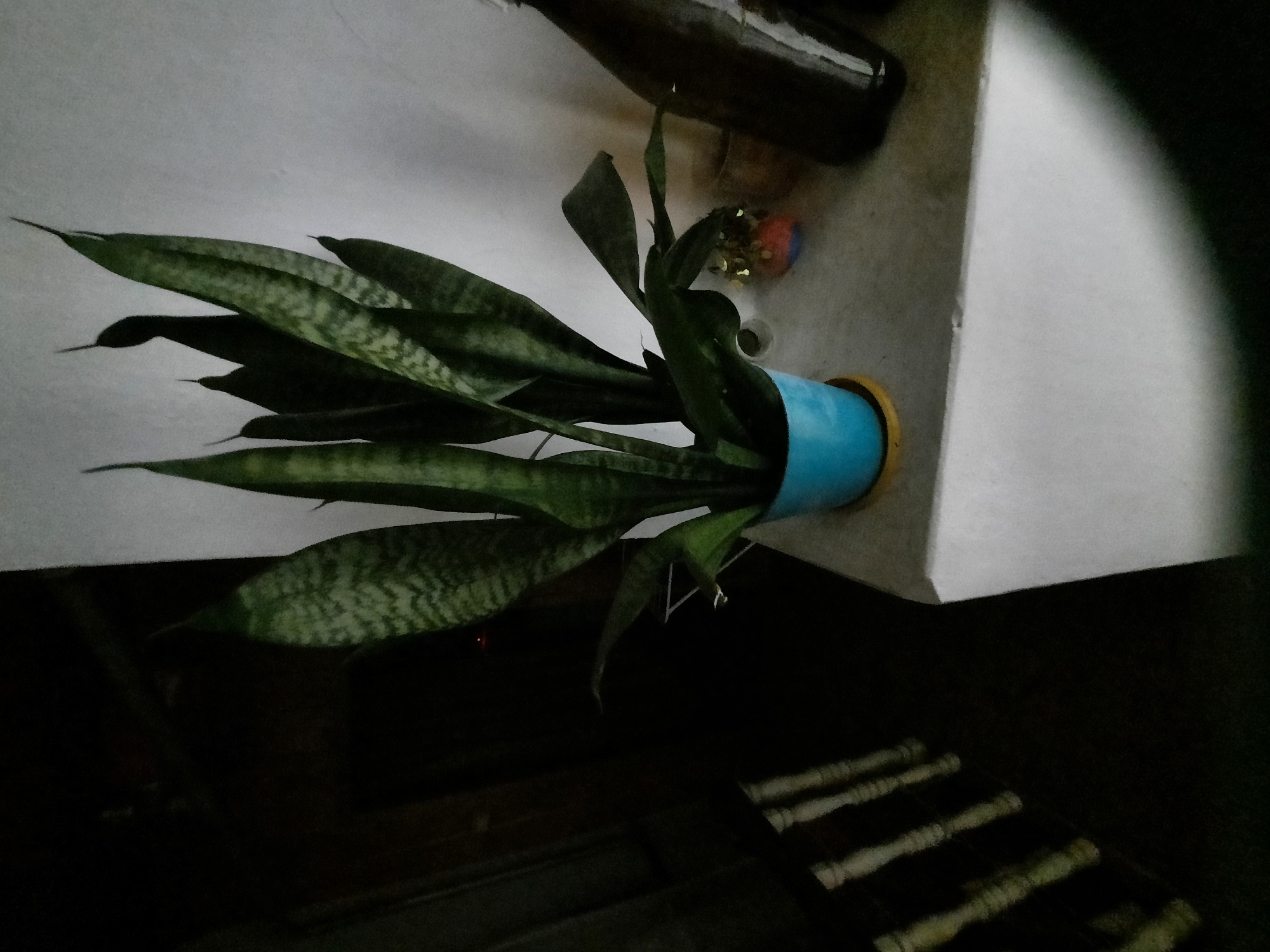 An indoor scene, likely within a residence or building in Архангельское, Russia, depicts a potted Sansevieria trifasciata plant positioned on a white, flat surface. The plant is housed in a light blue cylindrical pot, which rests on a yellow saucer. Its numerous upright, sword-shaped leaves exhibit green and lighter green variegated patterns. To the immediate right of the plant on the same surface, a small, multi-colored decorative object (orange, blue, and yellow elements) is present, adjacent to a dark, glossy bottle that is partially visible on the far right. The wall behind the plant is plain white. The left side and background of the image are significantly darker, revealing indistinct features, but notably include several light-colored, vertically oriented balusters or spindles in the lower-left quadrant, suggesting a railing or staircase in a dimly lit area. No individuals are present in the scene.