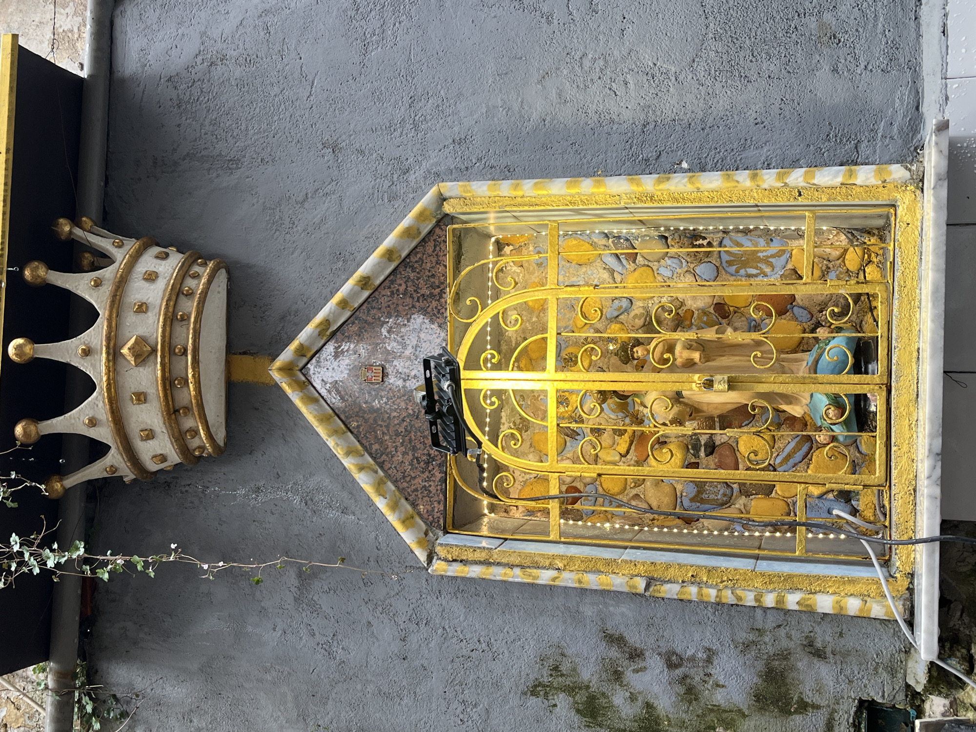- "An outdoor, wall-mounted shrine is depicted in Palermo, Italy, featuring a large, ornate crown positioned directly above a gabled niche on a textured, mottled grey wall" by FM-2Gry03, licensed under CC BY 4.0
