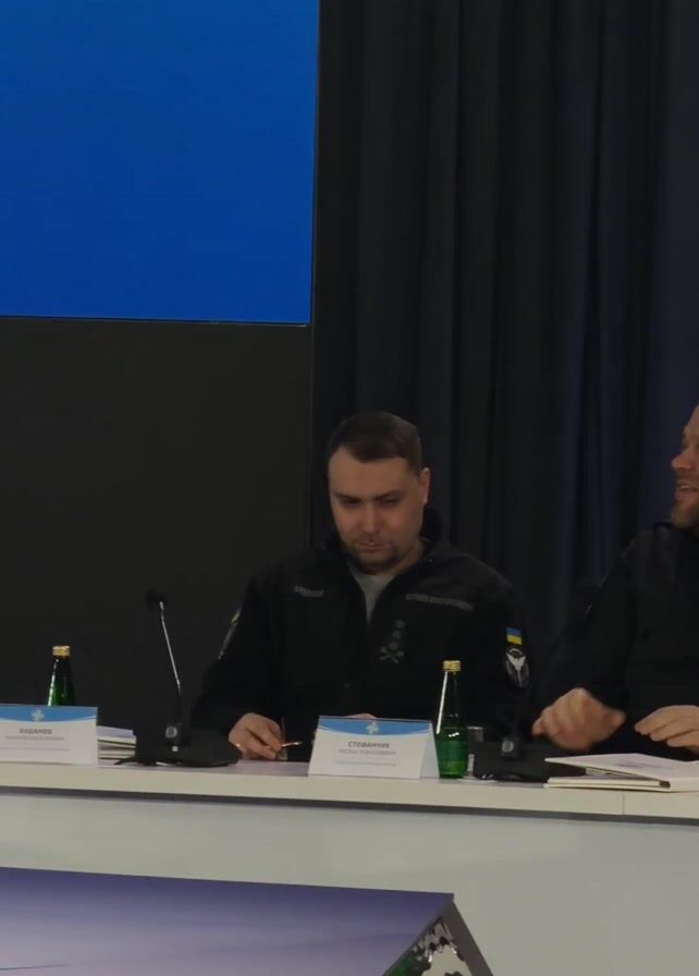 person with short brown hair at a table. The person is wearing a black jacket. They look to the right. There are papers, a microphone, and a bottle of water on the table in front of them. Behind the person, there is a blue screen and a dark curtain. Another person is sitting to the right, partially visible in the frame. The video seems to be taken at a meeting or conference.