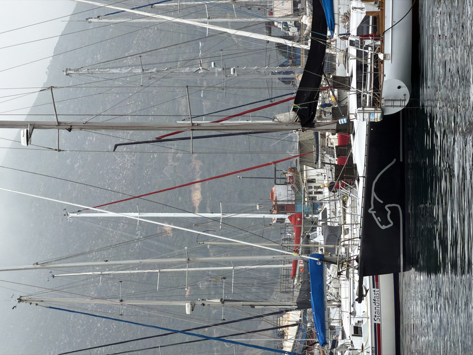 This image depicts a dense concentration of various vessels moored in a harbor in Hout Bay, South Africa, under overcast or misty conditions. The foreground is dominated by multiple sailboats, their masts, rigging, and booms creating a complex network of lines against a muted background. In the immediate foreground, the dark hull of a sailboat features a prominent white outline of a feline head, resembling a panther or puma. To its left, a white sailboat is partially visible, bearing the name "Standfast" in red lettering, accompanied by a red and blue stripe along its hull, and a blue sail cover on its boom. Another white sailboat's stern is visible to the right of the black hulled vessel, equipped with a boarding ladder. Many other sailboats fill the frame, displaying various colored mast shrouds and stays in red, blue, and white, with some booms covered by black or blue tarpaulins. In the mid-ground, behind the sailboats, larger working vessels are visible, including a prominent red-orange boat with a white cabin structure. Other industrial-looking boats and obscured dockside structures suggest a working harbor or boatyard environment. The background features steep, vegetated mountains, partially obscured by mist or haze, indicating the coastal geography of Hout Bay. A narrow horizontal lighter-colored strip visible on the mountainside suggests a road or path. The water in the foreground is calm, reflecting the boat hulls and rigging with subtle ripples. No discernible human figures or specific actions are clearly visible.